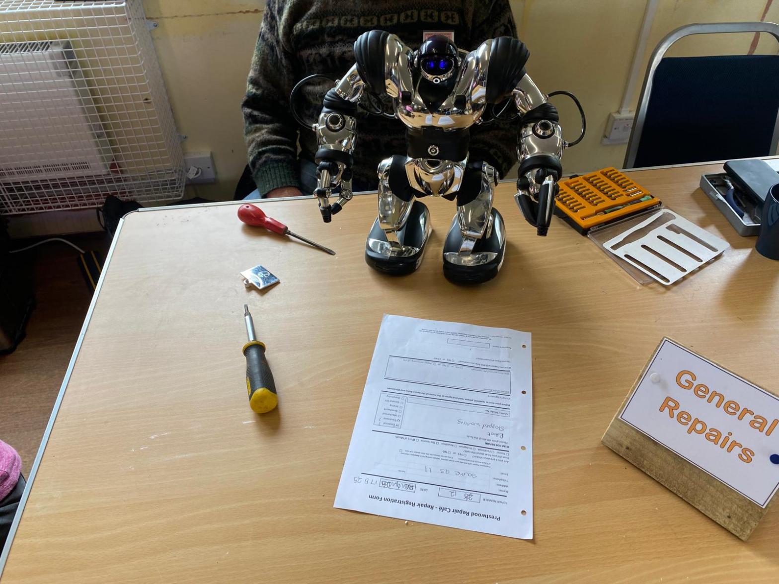 The café team brought a WowWee Robosapien toy back to life—a playful, interactive robot known for its kung fu moves, dance routines, and smartphone-controlled features, ready once again to entertain.